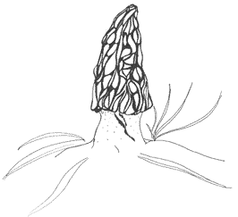 The fiddle head tastes of spring air, like smelt, trout, meltwater and of course, morels. I set about picking the shoots on a meandering course to a lower stand of aspen--my secret spot. The fern sprigs will make a nice addition to the lunch I am counting on finding in this secret aspen hollow. I pause, and sure enough my eye finds the silhouette of the game which I leisurely stalk. Morchella elata, the elusive, delectible, true black morel that has, at least as far as I'm concerned, no equal in the fungus world. By far the tastiest little morsel of edible mushroom you can lay your hands on, it commands a huge following of gatherers and an even larger enterprise in the gourmet food market. For me though, it is just another of the free and simple pleasure that I have come to rely upon.