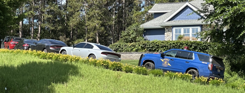 A blue Michigan State Police vehicle was seen outside the Divine residence, as well as several unmarked vehicles. A Leelanau County Sheriff’s vehicle was seen leaving the neighborhood on M-22 following the raid.