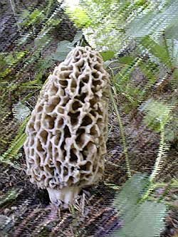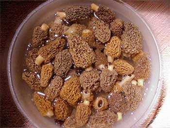 in that smell. Surely anyone can smell it. I dip my hands into the soaking mushrooms and swirl them around. The salt in the water makes the bugs come out, if there are any. In the bright kitchen light the mushrooms shine in the thickness of the water. Now I look carefully at each one, and can even remember them individually, can more or less tell you where each one came from. In each mushroom is contained a little memory, stored up then to be released now as I stand at the kitchen sink. When I picked them I was too busy looking for more to appreciate the finer points and qualities of each one, but now I remember. There is a kind of mini release of feeling and memory as I deal with these mushrooms. I plunge my arms into the water almost up to my elbows and lift the heavy load from the bottom to the top repeatedly, until my eyes begin to stop focusing on anything other than the oily surface of the water. After ten minutes I drain the water away. The morels are still rubbery and firm. Pirates and maniacs. When the long sought treasure is finally unearthed, do they really plunge their hands in up to their wrists and throw the stuff around, or is that just Hollywood? Pirate hands plunge in deeply, drawing up a handful of pearls, doubloons and emeralds, letting them spill with reckless abandon to the sand, laughing all the time, as if to say "there's plenty more where that came from." Wouldn't you want to get the treasure safely in the bank before you started celebrating? Wouldn't you want to account for each and every gold doubloon before you let it spill carelessly into the beach sand? And what about those athletes on TV. who love to waste champagne? Look at those dumb football players in the locker room after winning the big game. Their sole objective seems to be to shake up the bottle and squirt it at the camera. Why? What does it mean? I wonder about this as I am hypnotized by the slippery morels that I transfer to the colander. I make sure not to waste any. Winter has been long. |